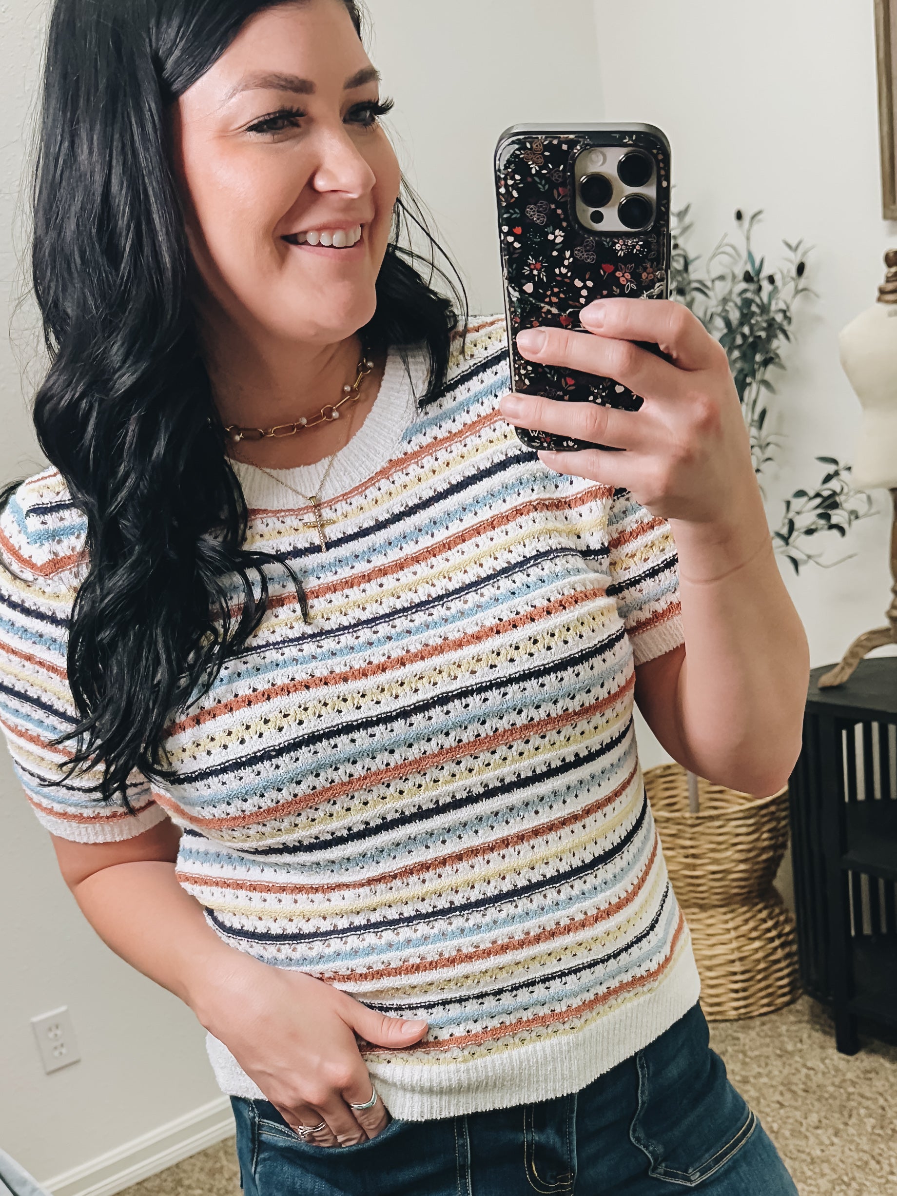 A versatile short-sleeve sweater top featuring a vibrant multi-color striped pattern. Crafted from lightweight cotton with a classic crew neck, it's designed for comfort and breathability. Ribbed detailing at the sleeves,